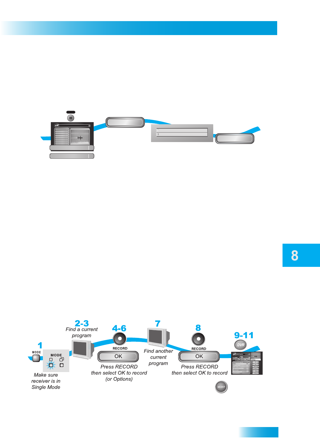 In Single Mode, you can set up the satellite receiver to record two programs while