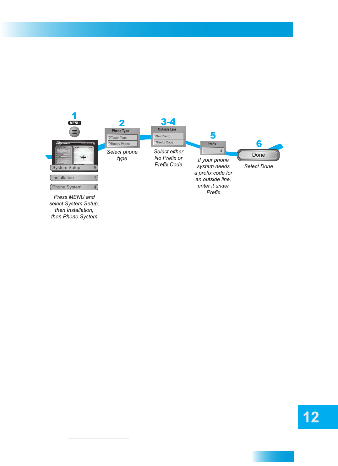 1 Press MENU, then select System Setup, Installation, and then Phone System.