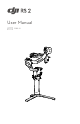 DJI RS 2 User Manual DJI RS 2 Diagram 1 2 14 13 25 24 23 15 16 12 3 4 5 6 7 8 9 22 21 17 20 19 18 10 11 1. Tilt Lock 13. Lower Quick-Release Plate 2. Tilt Motor 14. Upper Quick-Release Plate 3. Pan Lock 15. Roll Motor 4. Pan Motor 16. Roll Lock 5. Touchscreen 17. Grip Lever/Safety Button 6. Ronin Series Accessories (RSA)/ NATO Ports 18. Battery Level Indicators 7. Power Button 20. Power Port (USB-C) 8. Camera Control Button 9. M Button 10.
