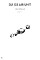 DJI O3 Air Unit DJI O3 Air Unit is an advanced video transmission device featuring DJI long-range low-latency HD transmission O3+ technology. The air unit can be mounted on a racing drone and used with DJI goggles and a remote controller to transmit video, control signals, and flight controller information wirelessly. Diagram 1. Camera 2. Coaxial Cable 8 7 3. Linking Status Indicator 2 4. Link Button 1 5. 3-in-1 Port 3 4 6 5 6. Dual-Band Dual-Polarized Antenna (IPEX1 connector) 7. USB-C Port 8.