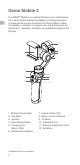Osmo Mobile 2 OSMOTM Mobile 2 представляет собой стабилизатор, который превращает ваш мобильный телефон в интеллектуальную камеру, стабилизируя ее во время движения. Мобильный телефон может быть установлен на Osmo Mobile 2 вертикально или горизонтально. Стабилизатор прост в использовании и обладает такими функциями, как ActiveTrack, Timelapse и Pano, доступными в приложении DJI GO. 12 11 10 1 9 RU 2 3 4 1. Держатель мобильного устройства 2. Электродвигатель оси поворота 3. Джойстик 4.