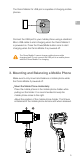 A porta USB do Osmo Mobile 2 é capaz de carregar telefones celulares. Conecte a porta USB ao seu celular usando um cabo micro USB para iniciar o carregamento quando o Osmo Mobile 2 estiver ligado. Pressione o botão Power/Mode uma vez para iniciar o carregamento quando o Osmo Mobile 2 estiver desligado. 3. Montagem e equilíbrio do celular O celular só deve ser montado e equilibrado quando o Osmo Mobile 2 estiver desligado. Monte o celular na posição horizontal.