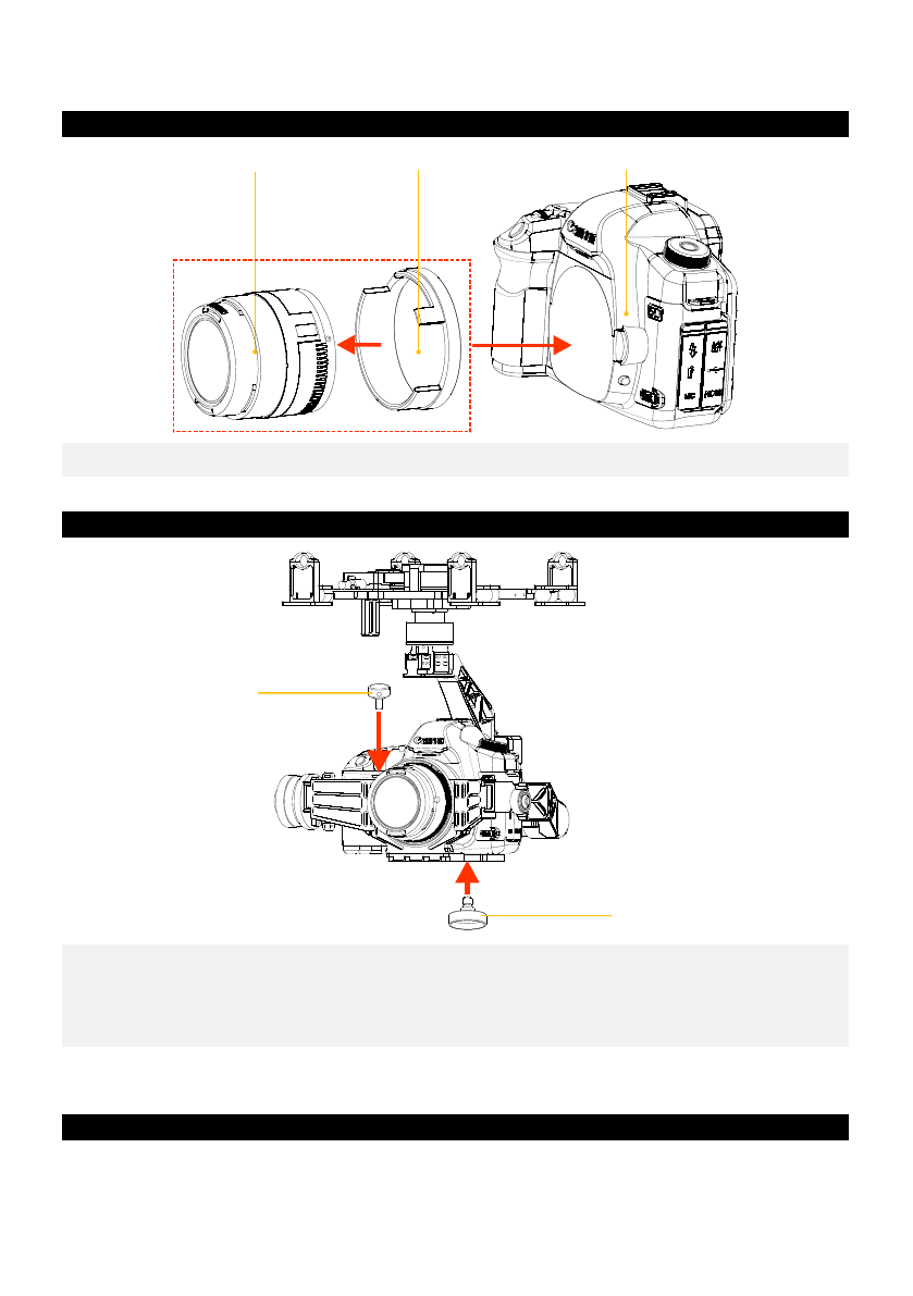 Step2: Mount the camera into the gimbal. Tighten the Camera Mounting Screw first then tighten the Lens