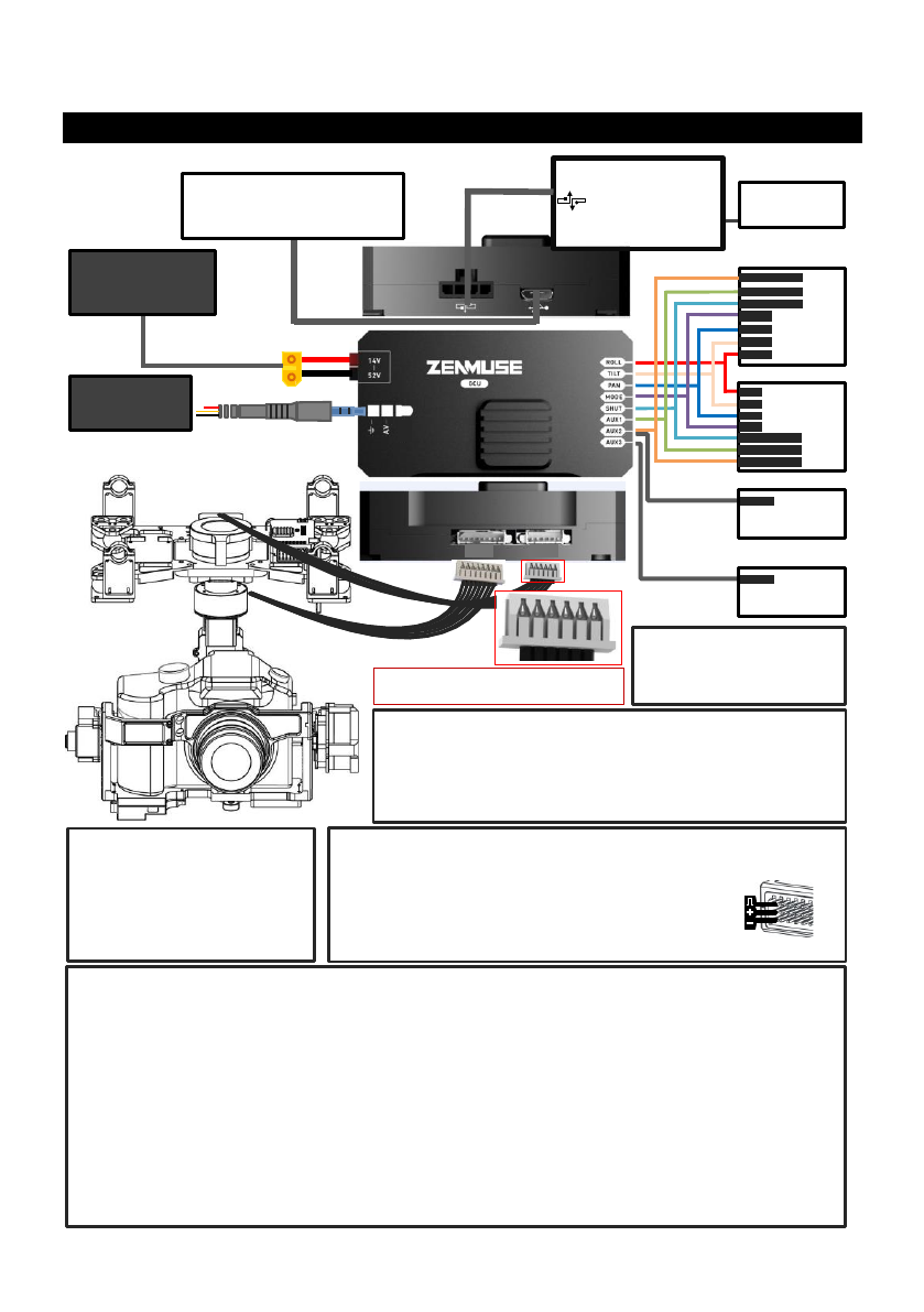 These are example connections. Prepare 2 TXs, one is for gimbal control, the other one for aircraft control, refer to