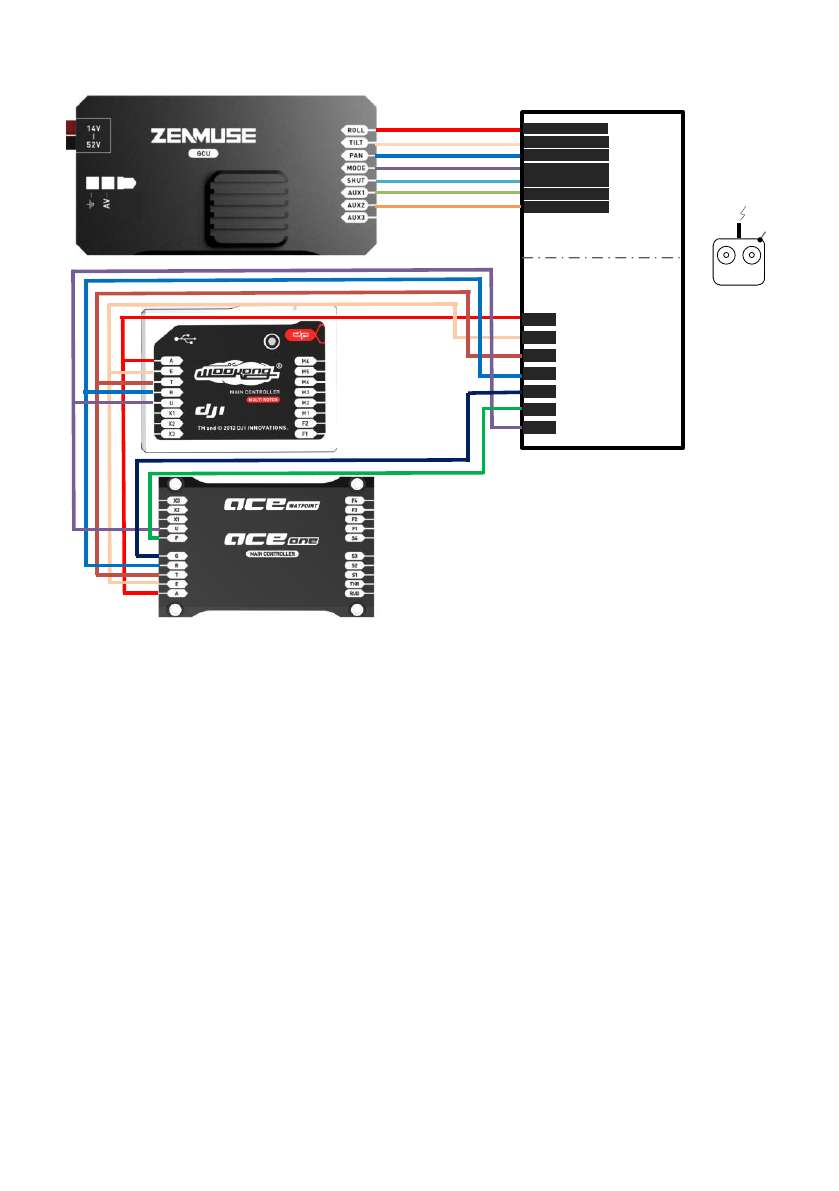 This is the example connection. Prepare one 14-channel TX/RC receiver for aircraft and gimbal control.