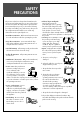 SAFETY PRECAUTIONS The present set has been designed and manufactured to assure personal safety. Improper use can result in electric shock or fire hazard. The safeguards incorporated in the present unit will protect you if you observe the following procedures in installing, using and servicing. The present unit is fully transistorized and does not contain any element that can be repaired by the user. • Influx of objects and liquids : Never let objects into the productthrough vents or openings.