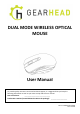DUAL MODE WIRELESS OPTICAL MOUSE User Manual To provide quality customer service and technical support, it is suggested that you keep the following information as well as your store receipt and this user manual. Date of Purchase: ________________________________ Product Rev. Number (located below the UPC on the package): ____________________ PID # 111680/1/2/3-109289 Rev.
