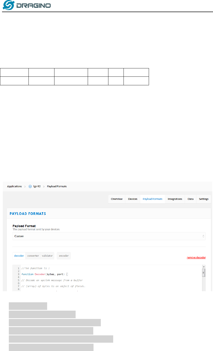 The uplink payload includes totally 12 bytes. Uplink packets use FPORT=2 and every 5 minutes