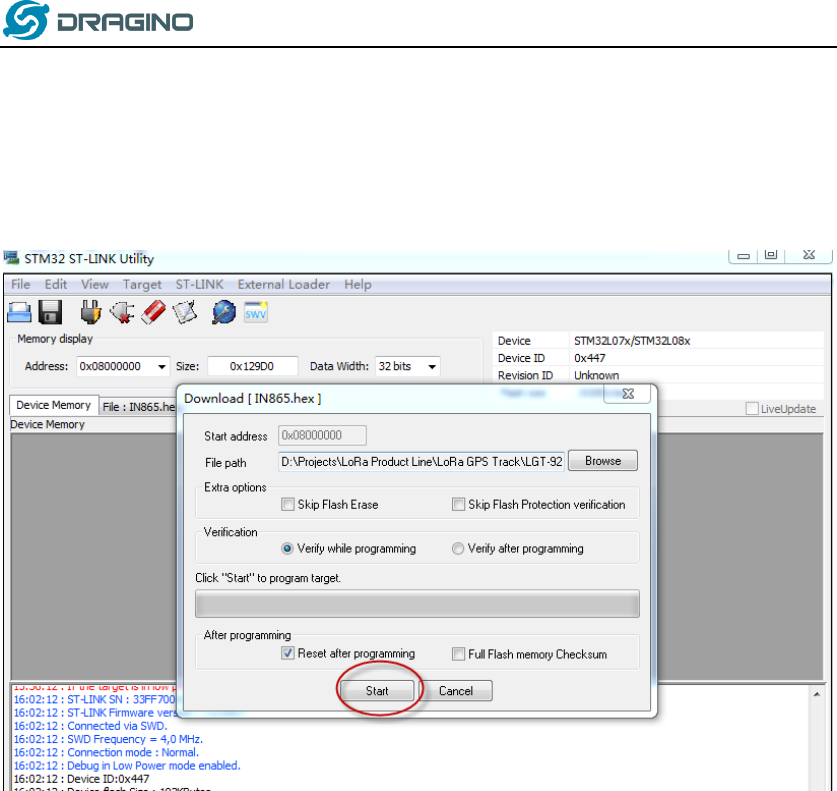 button on the LGT-92. The ST-Link utility will pop up a download window. Click the start button to