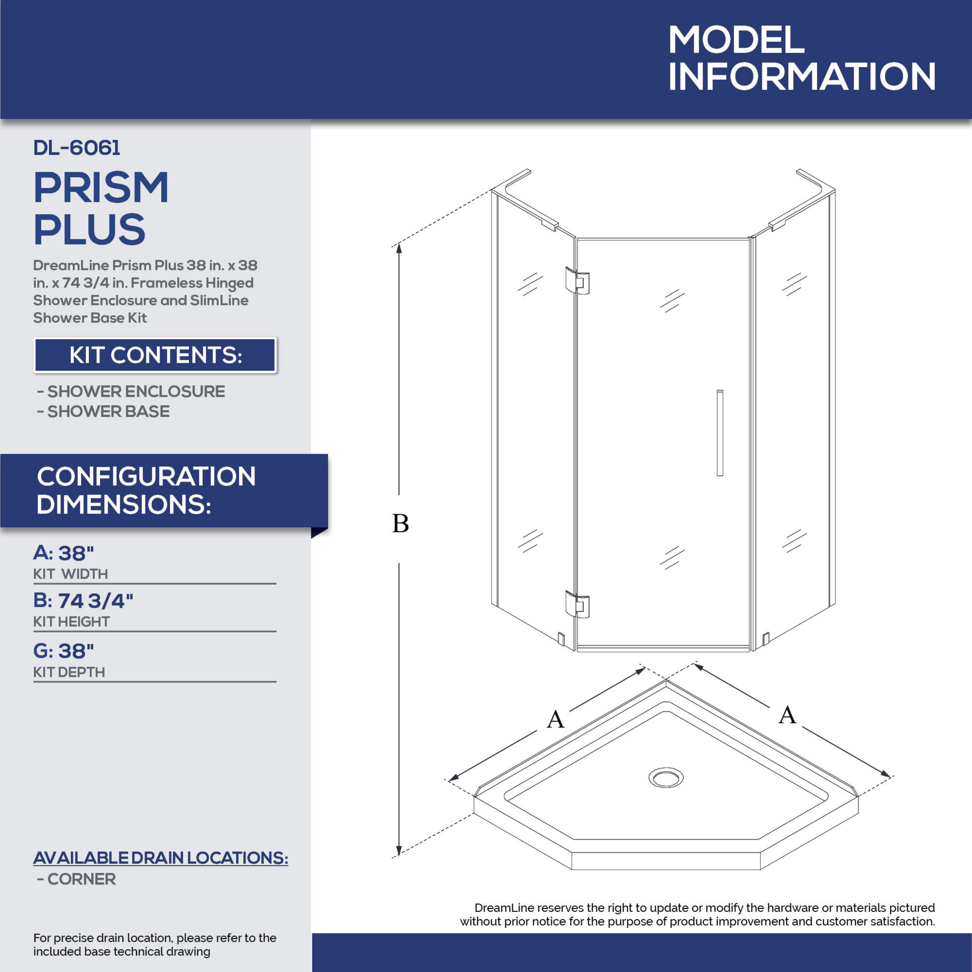 MODEL INFORMATION FL-6061 PRISM PLUS Dream Line Prism Plus Frame less Hinged Shower Enclosure and Slim Line Shower Base Kit KIT CONTENTS: | SHOWER ENCLOSURE SHOWER BASE CONFIGURATION DIMENSIONS: A: 38!! KIT WIDTH B: 74 3/4" KIT HEIGHT 2 38 KIT DEPTH AVAILABLE DRAIN LOCATIONS: CORNER Dream Line reserves the right to update or modify the hardware or materials pictured without prior notice for the purpose of product improvement and customer satisfaction.