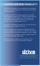 LIMITED LIFETIME WARRANTY Your Drive brand product is warranted to be free of defects in materials and workmanship for the lifetime of the original consumer purchaser. This device was built to exacting standards and carefully inspected prior to shipment. This Lifetime Limited Warranty is an expression of our confidence in the materials and workmanship of our products and our assurance to the consumer of years of dependable service.