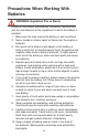 Precautions When Working With Batteries WARNING: Explosion Fire or Burns Follow all instructions published by the battery manufacturer and the manufacturer of the equipment in which the battery is installed. 1. Make sure the area around the battery is well ventilated. 2. Never smoke or allow a spark or flame near the engine or batteries. 3. Be careful not to drop a metal object on the battery or allow a metal tool to simultaneously touch the positive and negative cable ends or battery terminals.