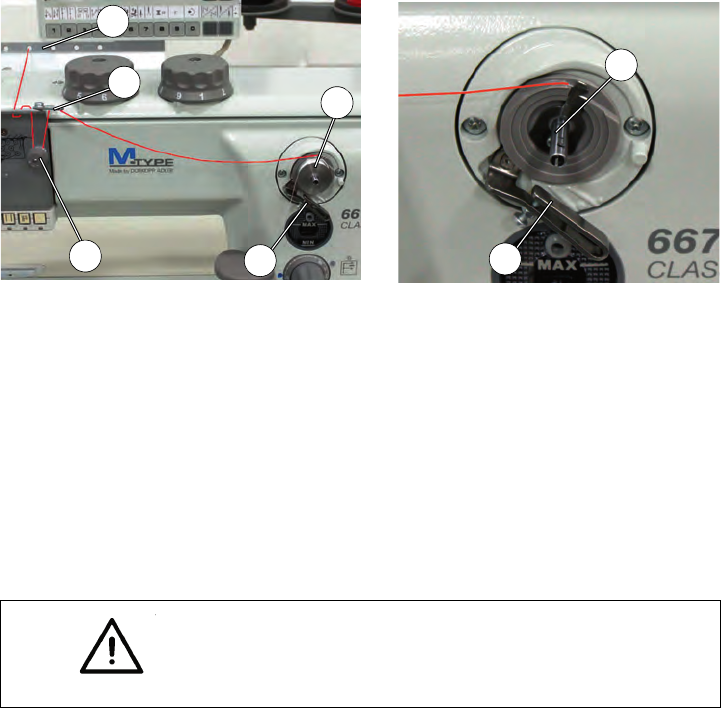 – Faden durch die Führung 5, die Spannung 3 und die Führung 4 ziehen.