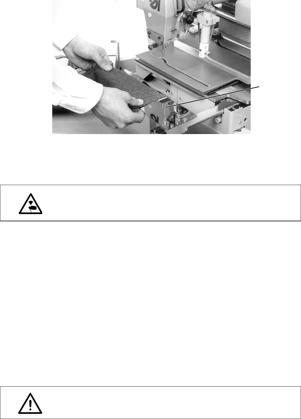 Nähgut mit der rechten Hand an der Vorderkante festhalten und