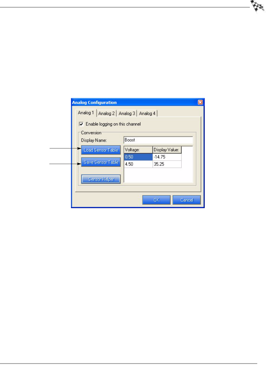 Figure 2-5: Analog Configuration Window—Save and Load Sensor Tables