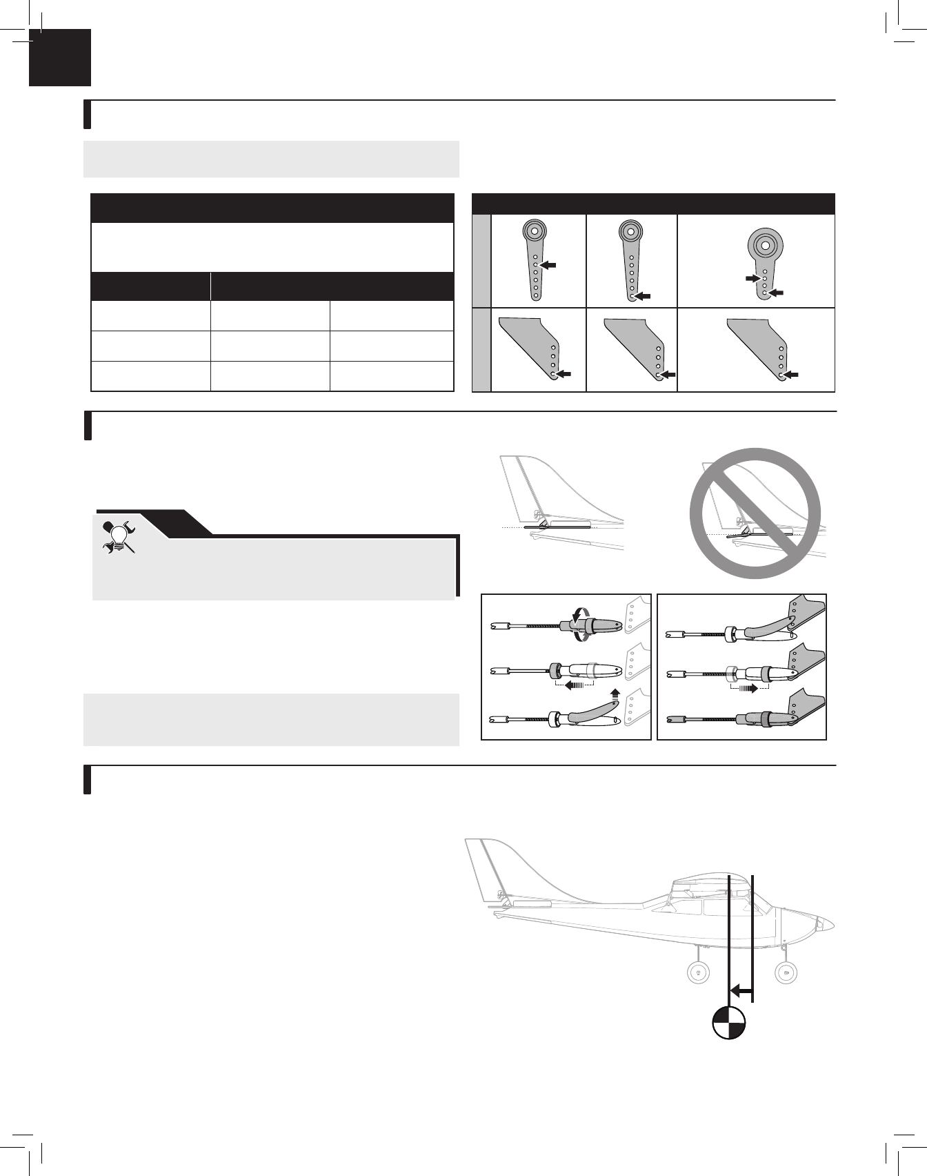 The Illustration shows the correct hole settings in servo arms and control horns.