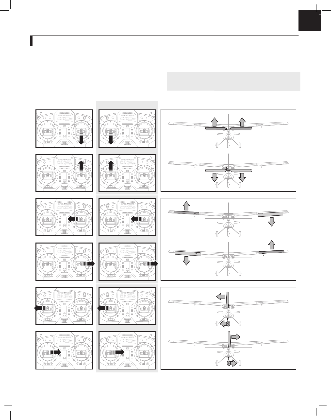 to adjust control surfaces. Move the transmitter control sticks so the model’s