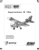 EN Flight Battery Installation, SAFE system and Electronic Speed Control (ESC) Arming 1. Rest the aircraft on a flat surface with the landing gear facing up and make sure the ESC switch is OFF. 2. Turn the latch (A) and open the battery hatch. 3. Lower the throttle and throttle trim, then power on the transmitter for at least 5 seconds. 4. Center and secure the flight battery (B) in the battery compartment using the hook and loop straps (C) so that the aircraft has a balanced Center of Gravity (CG).