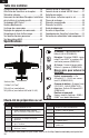 FR Test de direction des gouvernes Commande à l’émetteur Réaction de l’avion Descente Profondeur Affectez votre émetteur à votre avion avant de procéder à ces tests. Actionnez les commandes de l’émetteur pour vous assurer que les gouvernes de l’avion s’orientent correctement. Vérifiez que les tringleries peuvent bouger librement, qu’elles ne sont pas collées par de la peinture ou des autocollants.