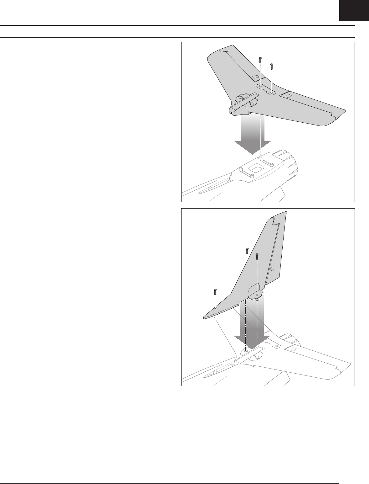 3. Insert three 3 x 16 mm screws through the vertical tail and into the fuselage.