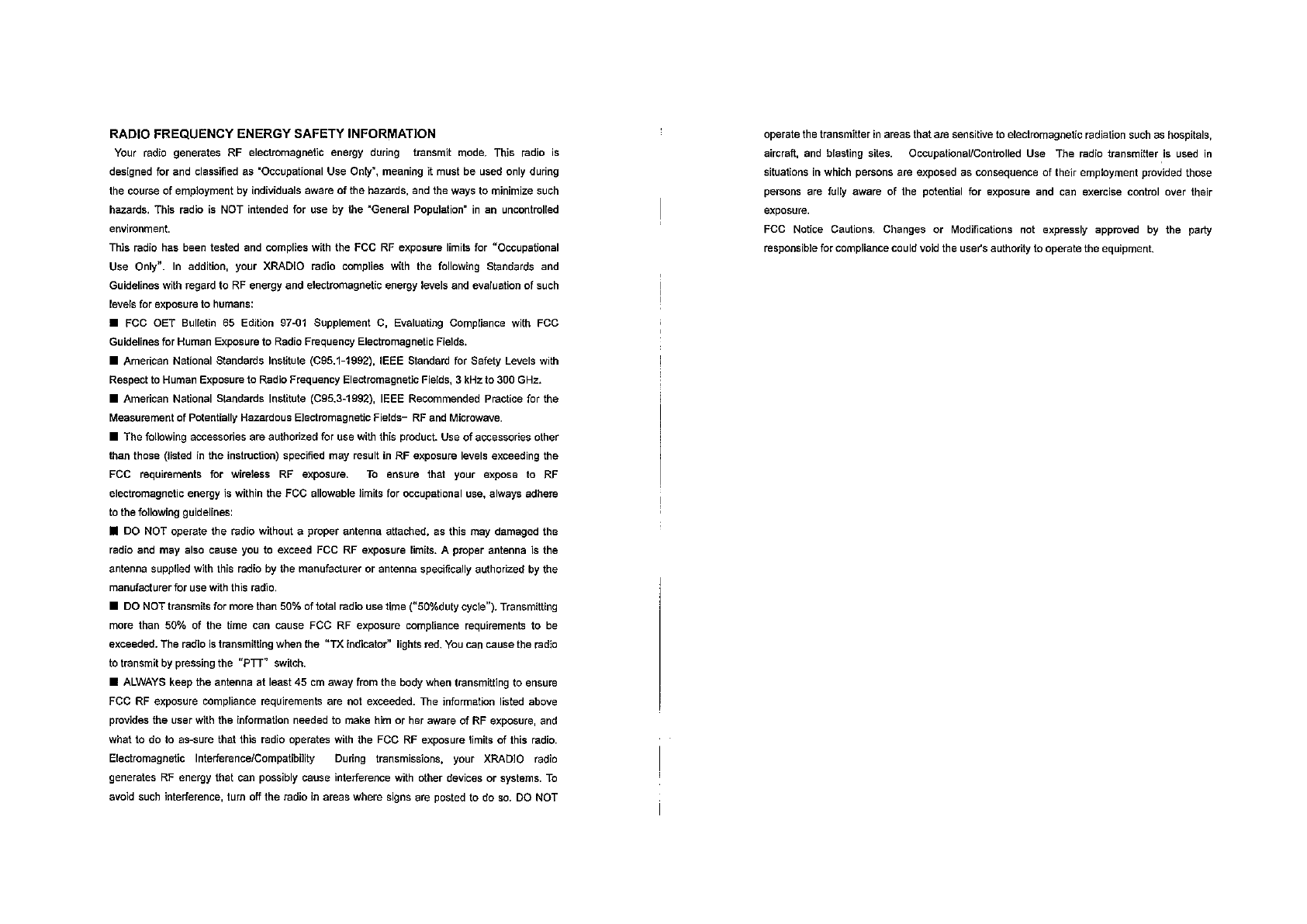 RADIO FREQUENCY ENERGY SAFETY INFORMATION Your radio generates RF electromagnetic energy suing transmit mode, This radio is designed for and classified as "Occupational Use Only’, meaning it must be used only during the course of employment by individuals aware of tha hazards, nd the ways to minimize such hazards. This radio is NOT intended for use by the “General Population” in an uncontrolled environment. This radio has been tested and complies with the FOC RF exposure limits for “Occupational Use Only".