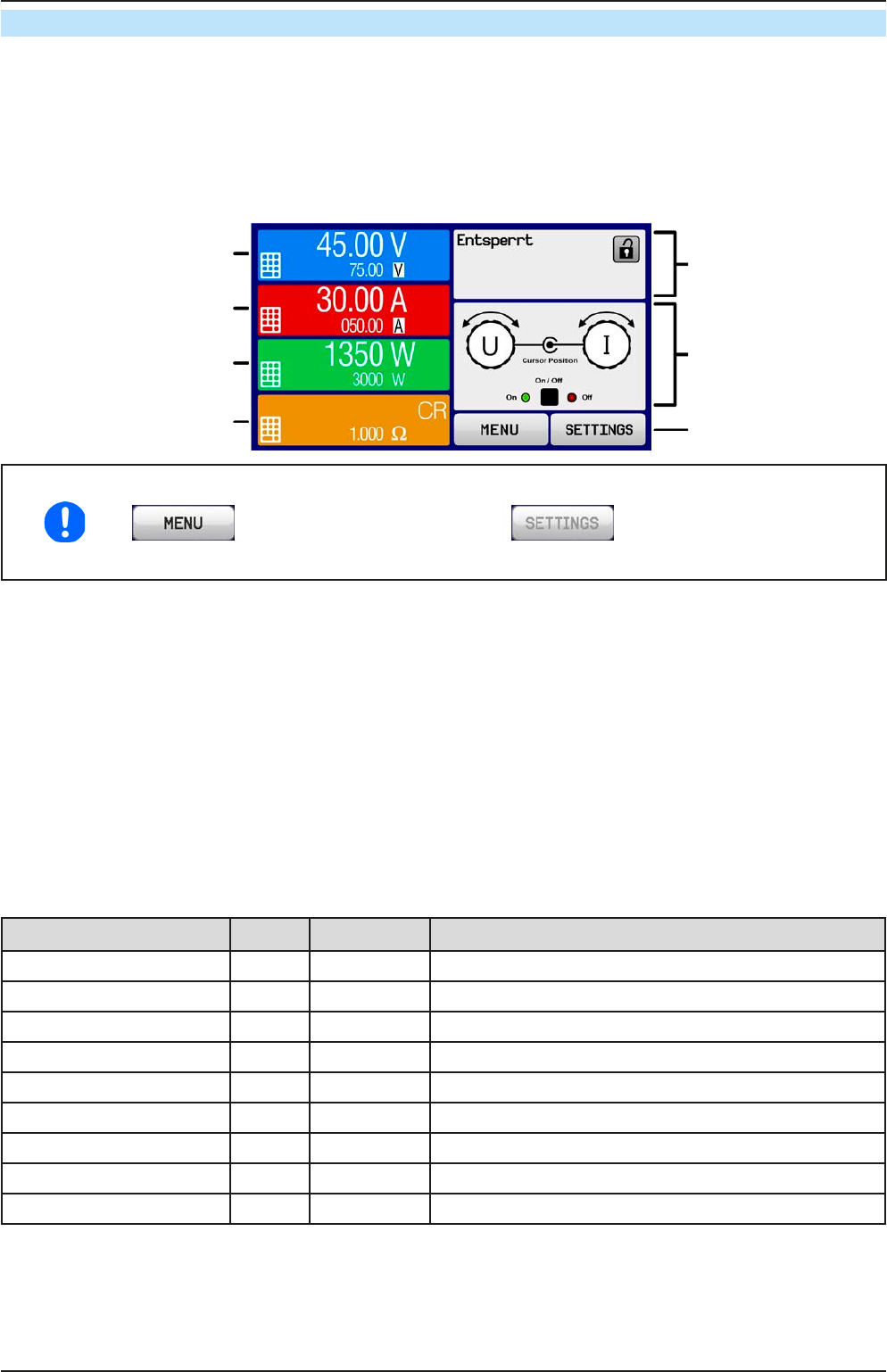 Neben den jeweiligen Einheiten der Istwerte wird bei eingeschaltetem DC-Ausgang die aktuelle Regelungsart CV,