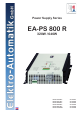 EN About User instruction manual Safety instructions Wall mount power supply Series PS 800 R Elektro-Automatik GmbH & Co. KG Helmholtzstrasse 31-33 41747 Viersen Germany Phone: +(49) 02162 / 37850 Fax: +(49) 02162 / 16230 Web: www.elektroautomatik.de Mail: ea1974@elektroautomatik.de • The cross section of the load leads has to match the nominal current of the device.