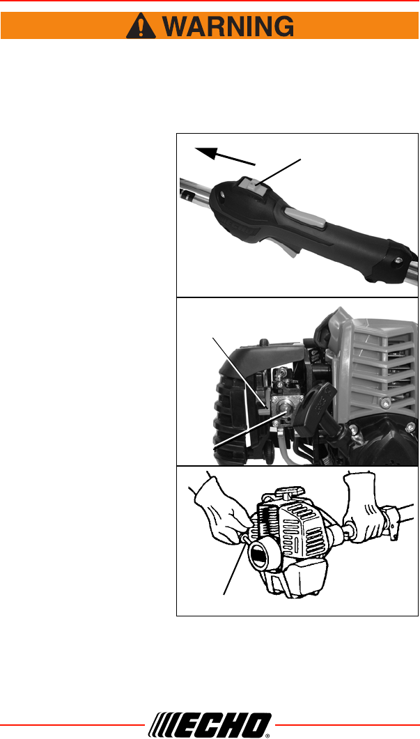 - 6. Drain fuel tank completely. Press purge bulb 6 - 7 times to remove remaining fuel from carburetor then drain the tank again. Close choke, start and run the engine until it stops due to lack of fuel.