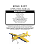EDGE 540T OPERATING MANUAL Specifications: Length: 33.1 inches Wing Span: 36.6 inches Wing Area: 17.9dm² Flying Weight: 19oz Wing Loading: 30.2g/dm² Motor: Brushless High Torque 850kv Motor Propeller: 11 X 4.7 Battery: 3 cell 11.1V Li-Poly 1800mAh Radio: F.M. 4 Channel on 72MHZ Band Speed Control: Sensorless 18 Amp Servos: 9 Gram Micro (3Pcs) Thank you for purchasing the Edge-540T.