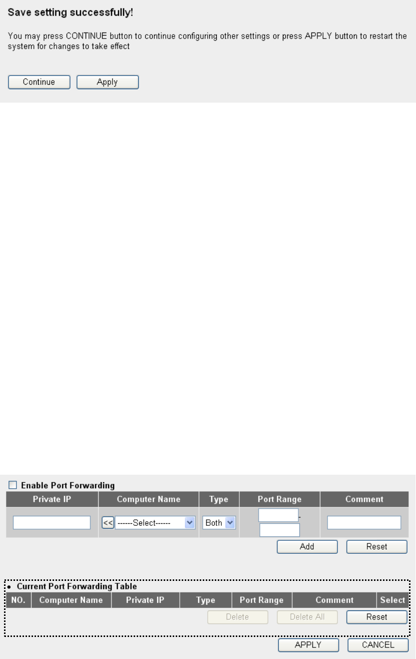 click „Port Forwarding‟, and the following message will be displayed on