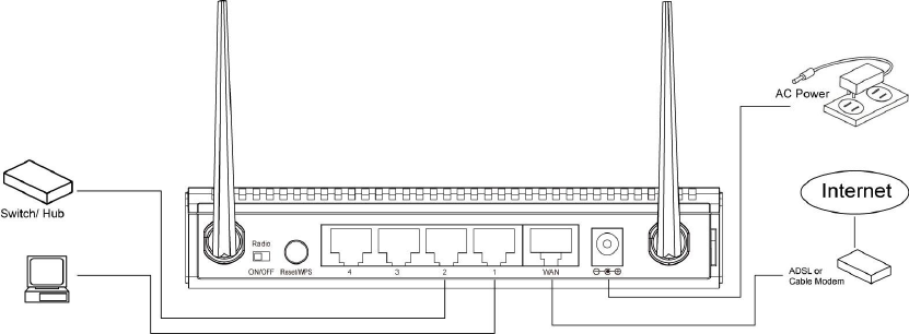 3. Connect the A/C power adapter to the wall socket, and then connect it