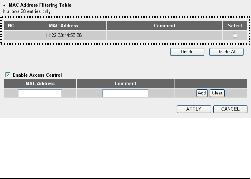 All allowed MAC addresses will be displayed in „MAC Address Filtering