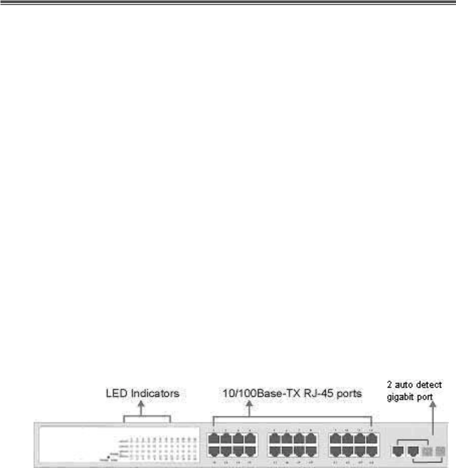 The front panel of the ES-5226RS consists of 24 x 10/100Base-TX RJ-45 ports