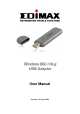 1. Product Introduction Thank you for purchasing Edimax Wireless 802.11b/g LAN USB Adapter. This adapter complies with IEEE 802.11g standard, which supports up to 54Mbps high-speed wireless network connections. It can also work with IEEE 802.11b devices. When the adapter connects to 11b devices, the link speed will be up to 11Mbps. For WLAN security issues, this adapter supports 64/128-bit WEP data encryption that protects your wireless network from eavesdropping.