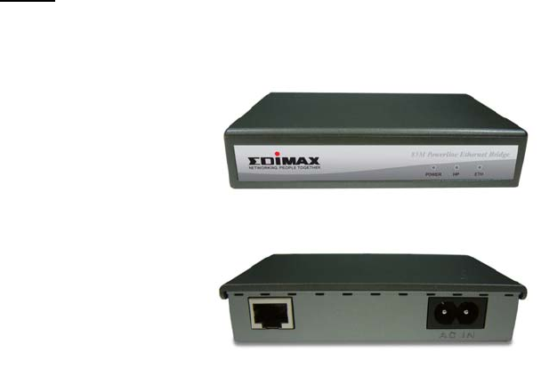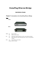 HomePlug Ethernet Bridge Installation Guide Chapter 1: Introduction to the HomePlug Ethernet Bridge Panel Front Back PWR: On Off Receive Power Did not receive Power HP: On Off Detect other HomePlug devices on the same powerline network Did not detect any other HomePlug devices on the same powerline network On Detect Ethernet connection ETH: Blinking Ethernet activity