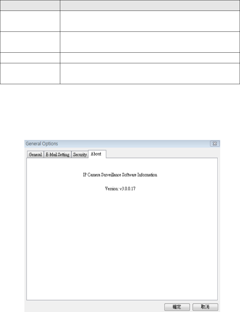 This tab shows the version number of the IP camera surveillance software