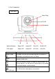1.4 Key Components Front View Focus Ring IR LED Microphone Wired & Wireless: Power LED Audio LED LAN LED WLAN LED POE model: Power LED Audio LED ACT LED LAN LED Item Description Power/Cloud The power LED will flash and light up when the camera is powered on and ready for access to Cloud. Audio LAN Indicates Audio status When the Network Camera is linked to a wired network, this LED will light up. The LED will flash while video is transmitted or received through a wired network.