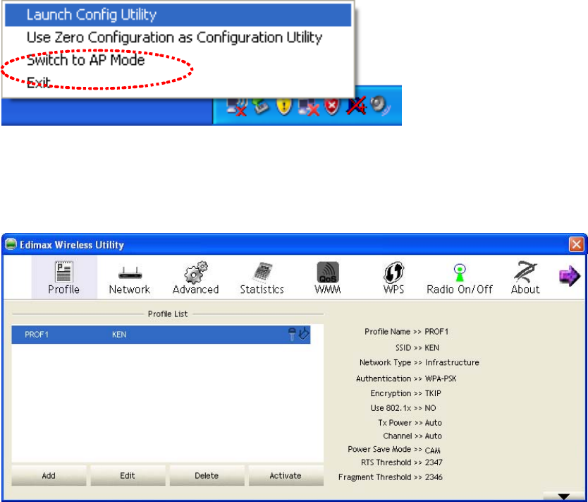 connect to a specific wireless access point. To manage profiles, right-click the Edimax
