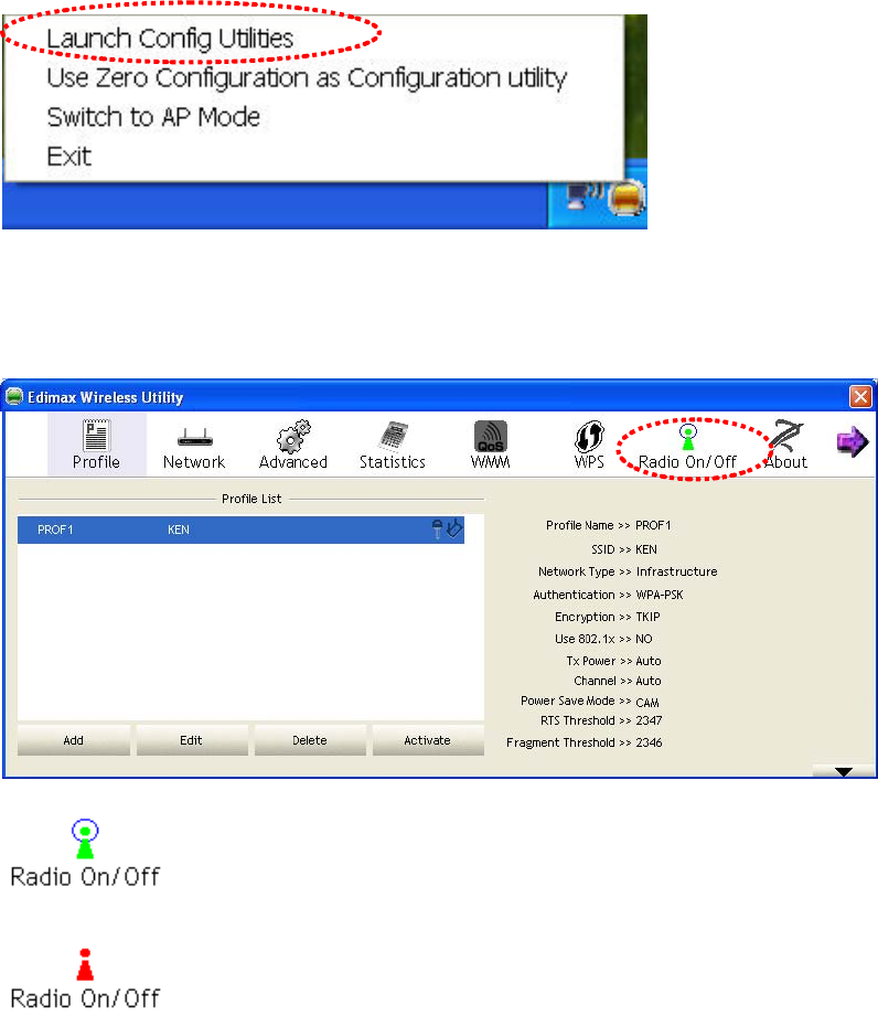 1. Right-click the Edimax configuration utility icon located at lower-right corner of computer