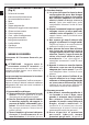 I Fasten the extension cable in the corresponding cable holder (D, Fig.15) each time before use. GB EXTENSION CABLES RECOMMENDED LENGHT (230 V) Lenght 0 ÷ 20 metri 20 ÷ 50 metri 50 ÷ 100 metri F Minimum conductor section 1 mm2 1.5 mm2 4 mm2 Required network voltage 230 V - With 10 A capacity and 8 A slowblow D safety fuse. WARNING - Use of neoprene or double insulation cables is recommended. E Cables should be fitted with safety plugs for external use.