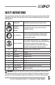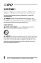 SAFETY INSTRUCTIONS This page depicts and describes safety symbols that may appear on this product. Read, understand, and follow all instructions on the machine before attempting to assemble and operate it. IPX4 V Safety Alert Indicates a potential personal injury hazard. Read the Operator’s Manual To reduce the risk of injury, user must read operator’s manual. Eye Protection Always wear safety goggles or safety glasses with side shields and a full face shield when operating this product.
