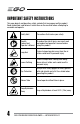 INTRODUCTION Nous vous félicitons d’avoir choisi le nouveau souffleur au lithium-ion de 56 V. Cet outil a été conçu et fabriqué afin de vous offrir la meilleure fiabilité et le meilleur rendement possible. Si vous éprouvez un problème que vous n’arrivez pas à régler facilement, veuillez communiquer avec le centre de service à la clientèle d’EGO au 1 855 EGO-5656. Le présent guide contient des renseignements importants pour assembler, utiliser et entretenir en toute sécurité votre produit.