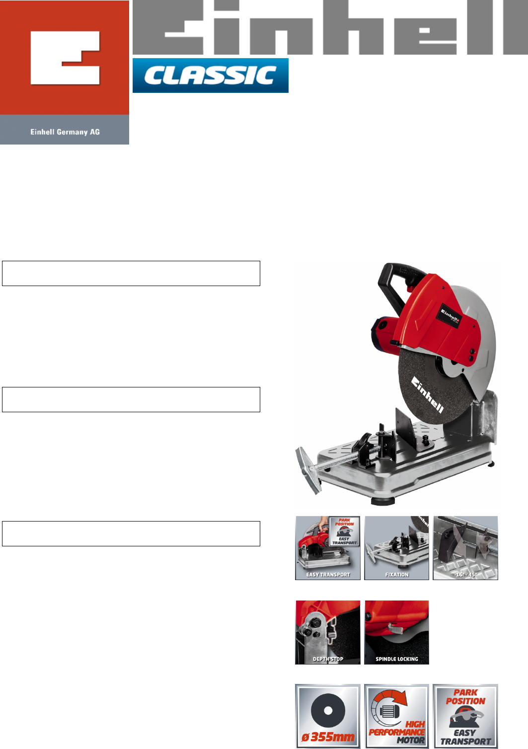 cutting wheel (Ø 355 mm x 25.4 mm x 3.2 mm) you are ideally equipped. The clamping mechanism with quick-release lock enables sizing cuts of -15 to