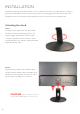 INSTALLATION Install the stand as described below, or if you want to mount it to a wall, please contact a professional installer. Please ensure the monitor is not plugged into the wall socket and furthermore we recommend to get another person to assist in the following task.