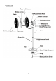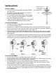 INSTALLATION BASE ASSEMBLY 1. Unscrew the RING and BASE LOCKING SCREW from the POLE. 2. Insert the POLE through the hole in the center of the BASE, and twist into position. 3. Turn the BASE upside down with the POLE facing the floor and place the BASE WEIGHT SUPPORT onto the underside of the BASE. 4. Tighten the BASE WEIGHT SUPPORT to the Base using the RING and BASE LOCKING SCREW. FAN HEAD ASSEMBLY 1. Remove the NECK FIXING BOLT and KNOB from the top of the INNER POLE. 2.