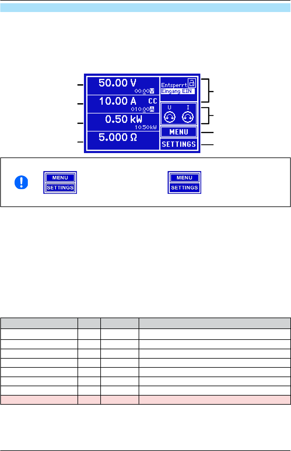 Neben den jeweiligen Einheiten der Istwerte wird bei eingeschaltetem DC-Eingang die aktuelle Regelungsart CV,