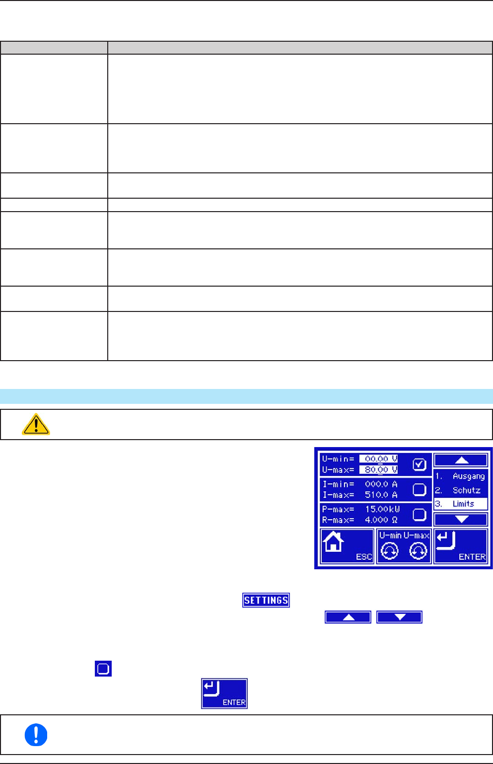 Spannung (U), Strom (I) separat untere und obere Einstellgrenzen