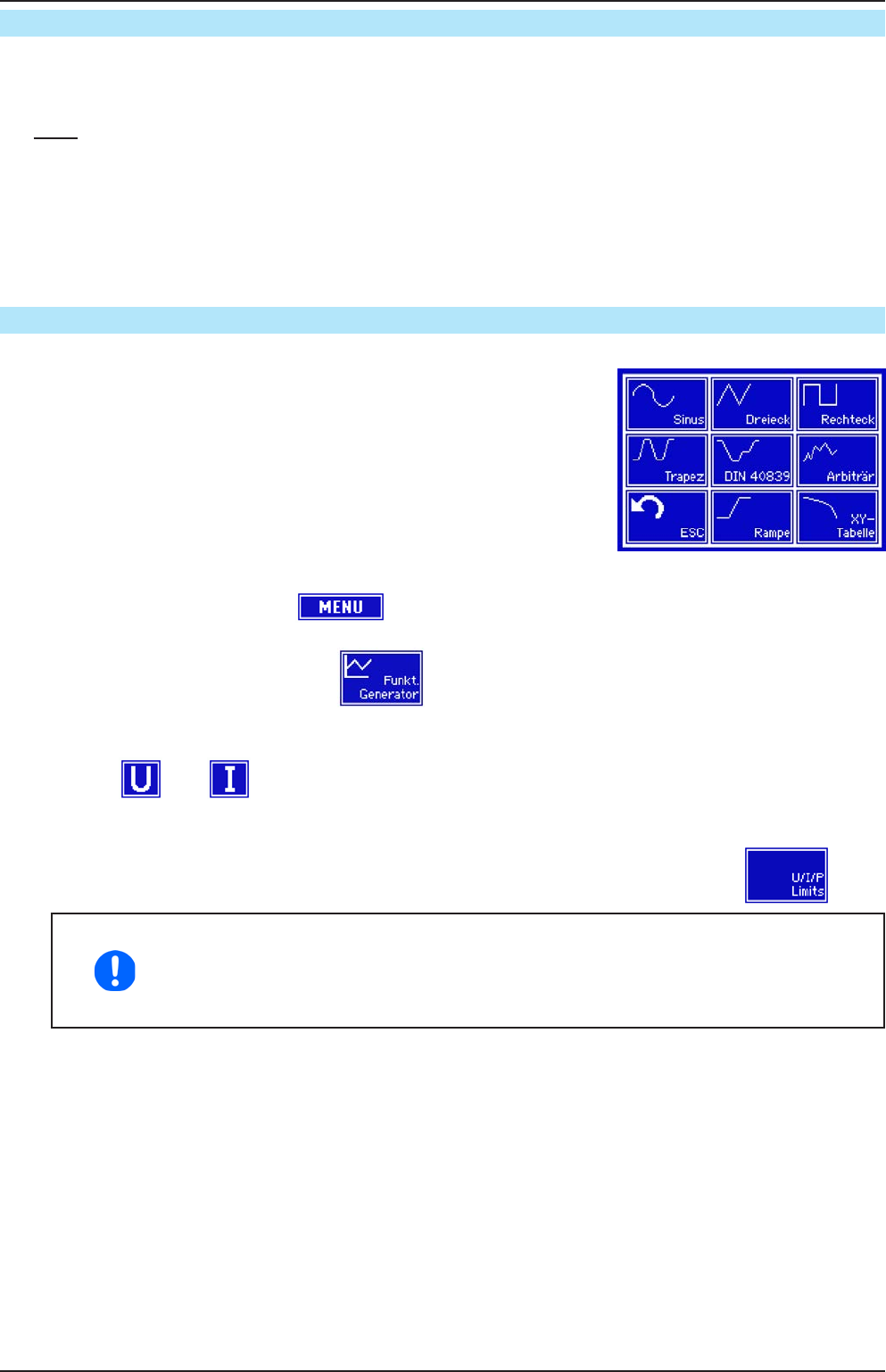 Das Gerät arbeitet auch im Funktionsgeneratormodus stets mit den drei Sollwerten U, I und P.