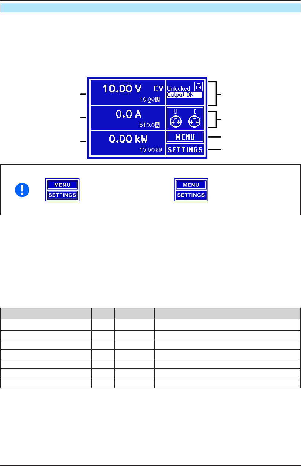 The graphic touchscreen display is divided into a number of areas. The complete display is touch sensitive and