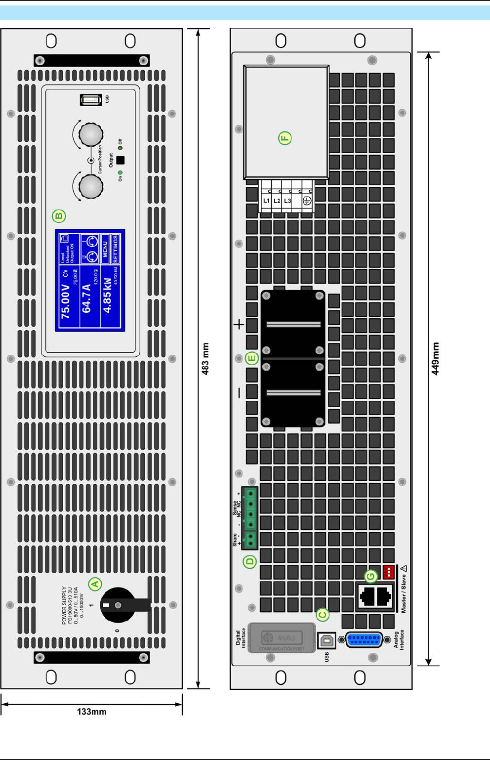 A - Netzschalter D - Share-Bus- und Fernfühlungsanschlüsse G - Master-Slave-Anschlüsse